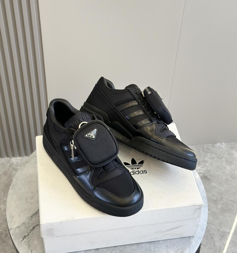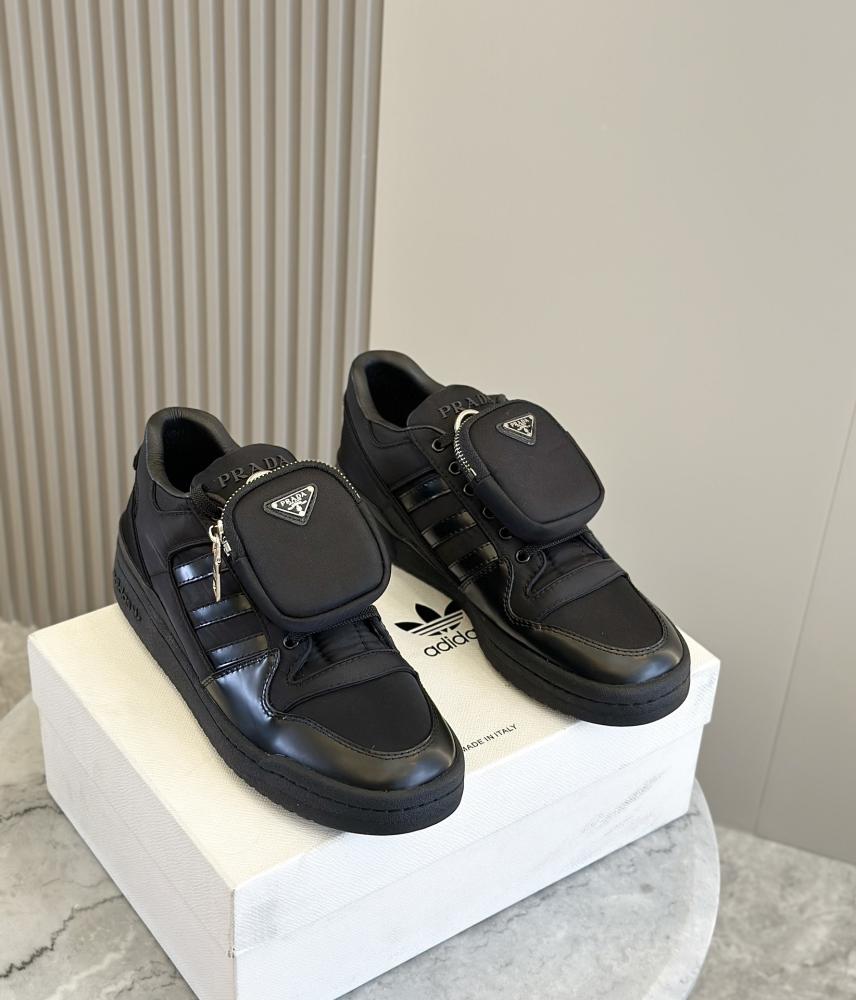 الاسم: حذاء رياضي تعاوني بين برادا وأديداس (للأزواج)اللون: اسودالمواد:نايلون معاد التدوير من برادا (Re-Nylon)جلد فاخرحقيبة صغيرة قابلة للفصل مع شعار معدني بالمينا على شكل مثلثنعل مطاطي بنمط أصلي